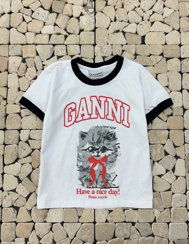 가니 화이트 배색 리본캣 크롭 반팔