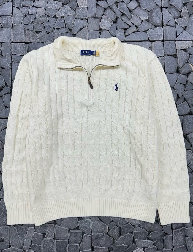 폴로 아이보리 피마코튼 케이블 반집업 니트