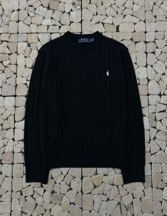 폴로 블랙 꽈배기 라운드 니트